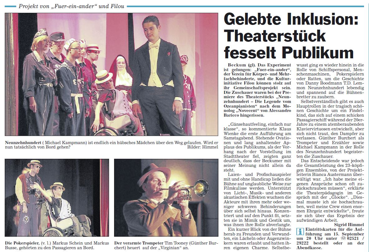 Das 22 köpfige Ensemble ist durch eine Kooperation zwischen dem Stadttheater Beckum, bzw. der „Kulturinitiative Filou e.V.“ und „Für-Ein-Ander“ einem Verein für Körper und Mehrfachbehinderte im September 2011 entstanden. Die Inszenierung baut auf die vielfältigen Charaktere auf, die das Leben an Bord aus sehr unterschiedlichen Perspektiven zeigen. Dies geschieht mal auf sehr poetische aber auch auf rattige und lustige Art und Weise. Das inhaltliche Ruder hält dabei der Erzähler dieser Geschichte, der Trompeter Tim Tooney, gespielt von Günter Burchert in der Hand.